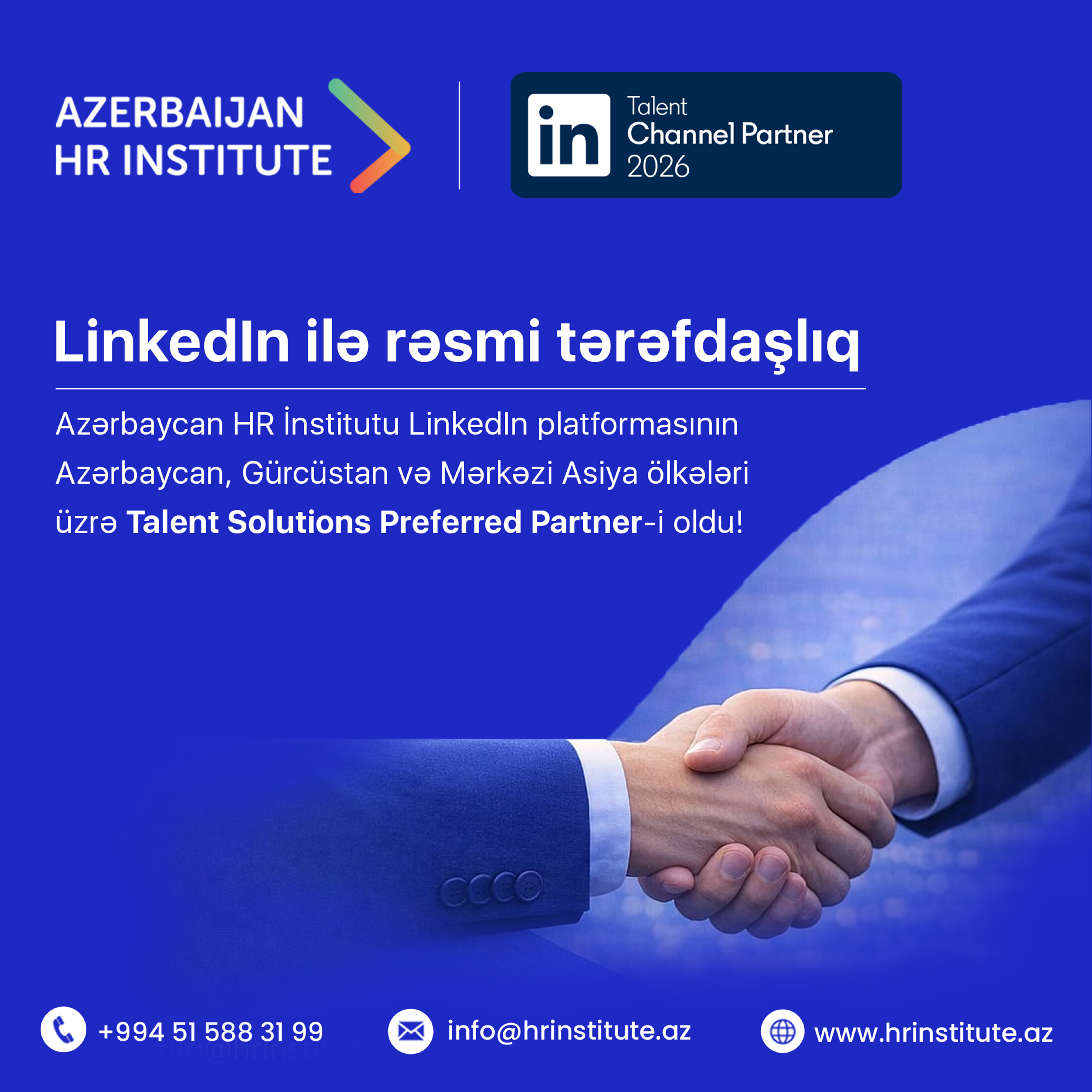 Dünyanın ən peşəkar biznes platforması olan “LinkedIn” ilə imzalanmış rəsmi tərəfdaşlıq müqaviləsinə əsasən, Azərbaycan HR İnstitutu Azərbaycan, Gürcüstan və Mərkəzi Asiya ölkələri üzrə LinkedIn-nın rəsmi tərəfdaşı olub.