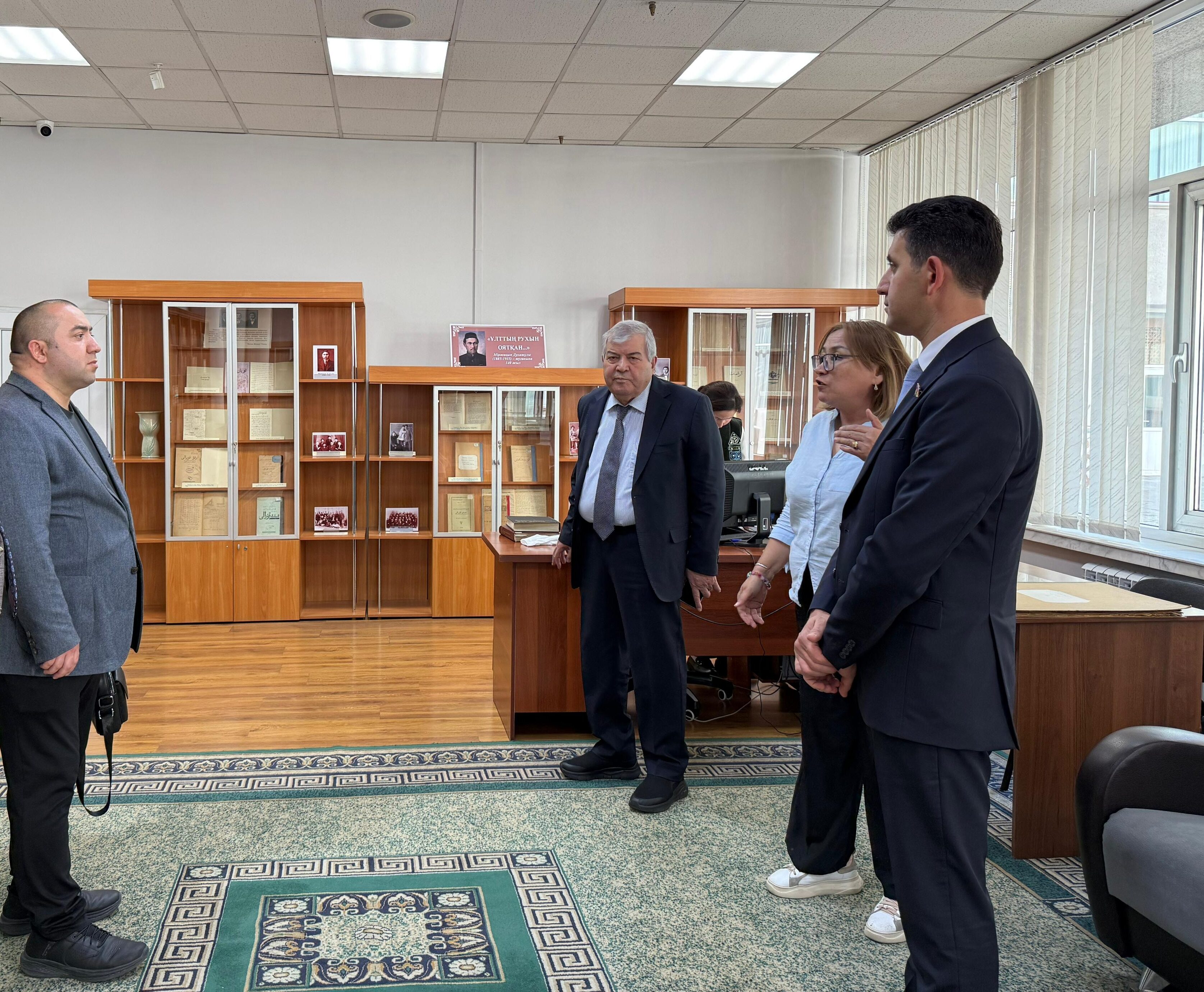 Yenicag.az xəbər verir ki, Xalq şairi Sabir Rüstəmxanlı, Milli Məclisin deputatı Naqif Həmzə, Azərbaycan Mətbuat Şurası İdarə Heyətinin üzvü, “Yeni Çağ” Media Qrupunun baş direktoru Aqil Ələsgər, Azərbaycan Turizm Assosiasiyasının Nəzarət-Təftiş Komitəsinin sədri Rəhman Quliyevdən ibarət heyət kitabxananın direktoru Qaziza Nurqalıyeva tərəfindən qəbul edilib.