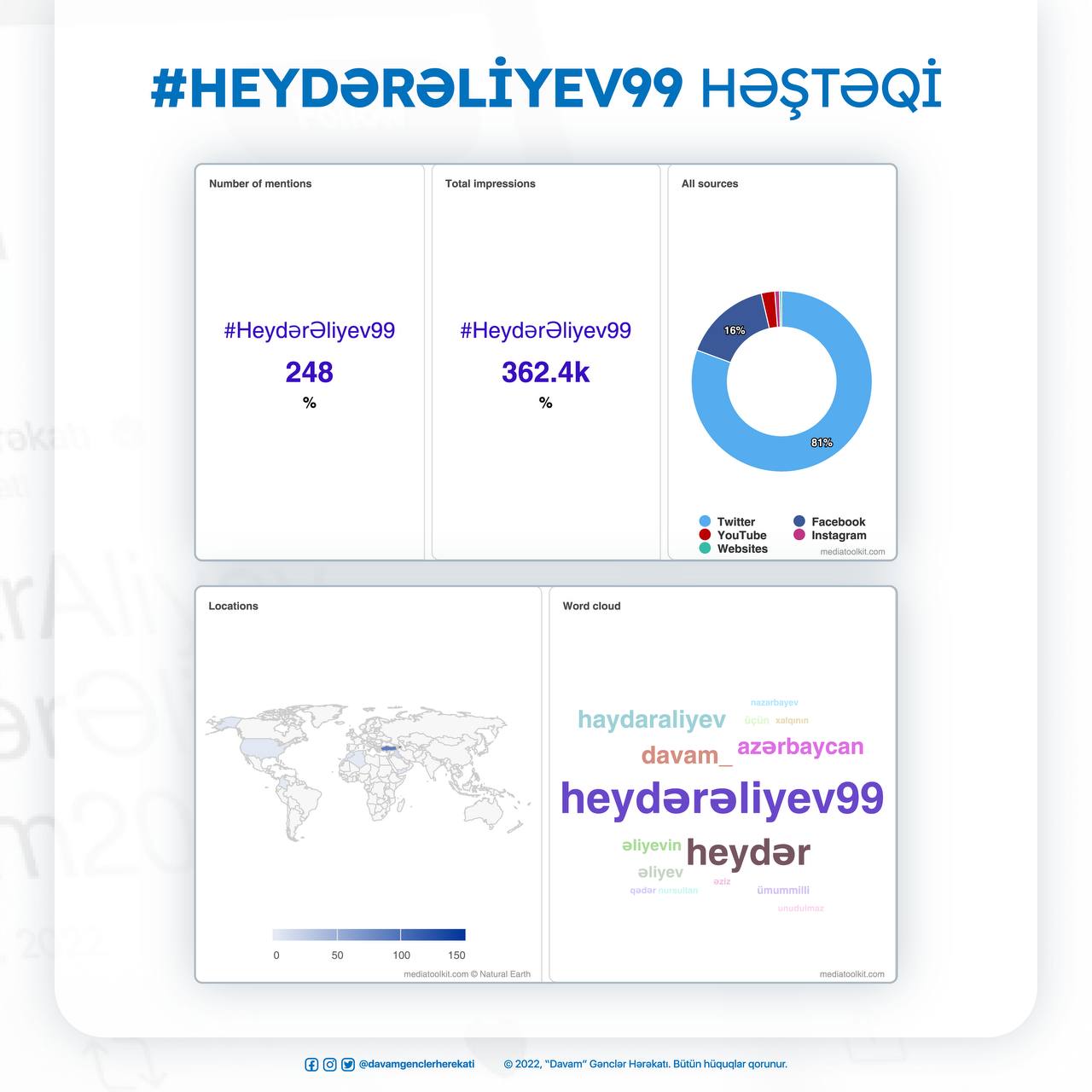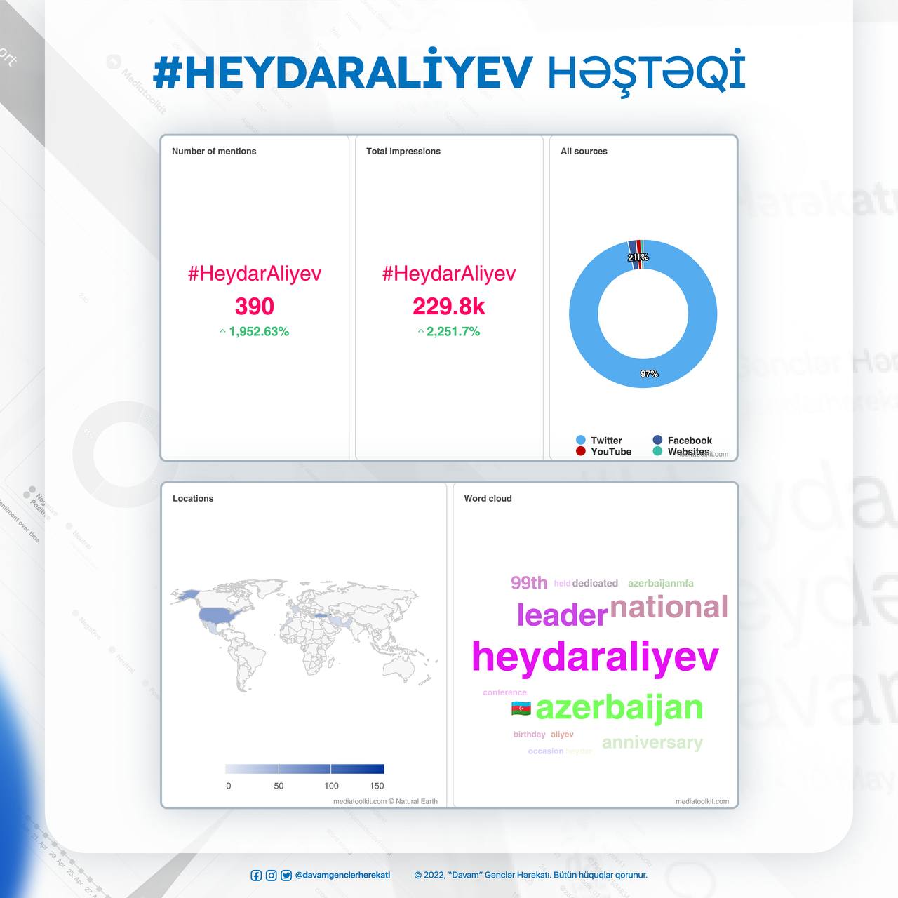 Paralel olaraq 10 may səhər saatlarından etibarən “Twitter” sosial media platforması üzərindən “Heydər Əliyev 99” adlı kampaniyaya start verilib. Kampaniya çərçivəsində 200-dən çox gənc #HeydarAliyev, #HeydərƏliyev99, #davam2022 həştəqləri ilə Ulu Öndərin həyat və fəaliyyətinə həsr olunmuş müxtəlif tvitlər paylaşıb. Bu tvitlər yarım milyondan çox istifadəçiyə çatıb və istifadə olunan həştəqlər Azərbaycan seqmentində “Twitter” gündəmi olub.